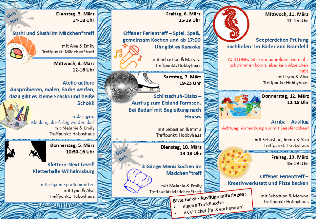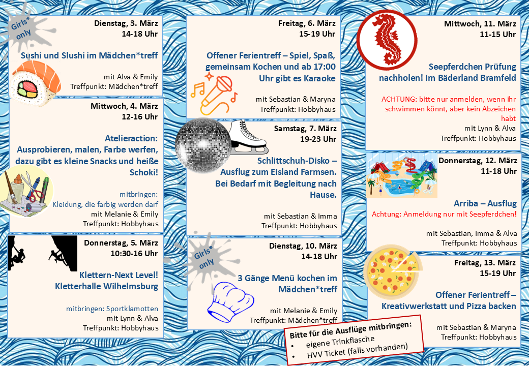 In den Märzferien gibt es wieder ein spannendes Ferienprogramm mit zahlreichen Ausflügen und vielen weiteren Angeboten. Bei einigen Angeboten könnt ihr einfach vorbei kommen, bei anderen müsst ihr Euch anmelden, weil die Anzahl der Teilnehmer*innen begrenzt ist. Anmeldezettel gibt es im Mädchen*treff und im Hobbyhaus oder als Datei zum Ausdrucken weiter unten auf dieser Seite.